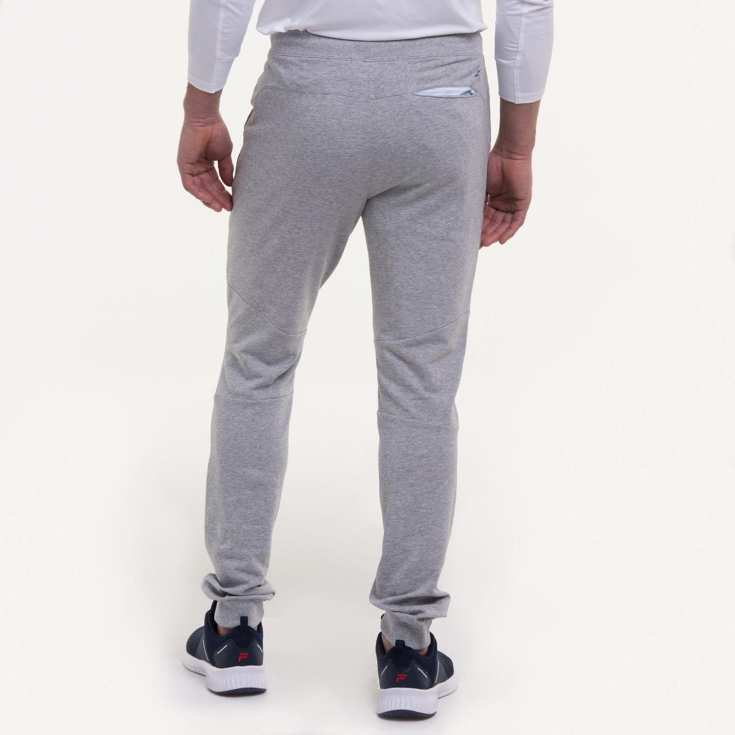 • Slim at the ankle with ribbed cuffs, and B. Draddy compass logo at back right waist
