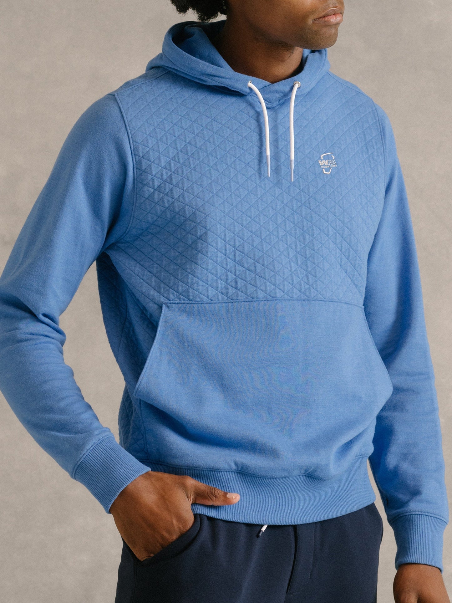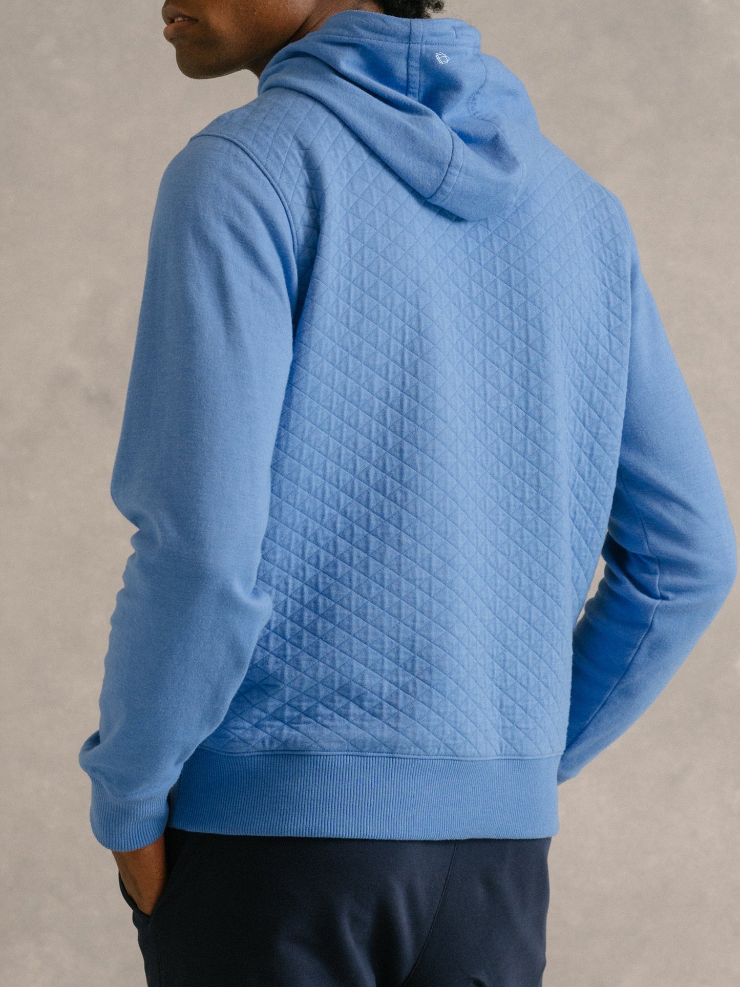 - Drawstring crossover hood with contrast drawcords and neck tape