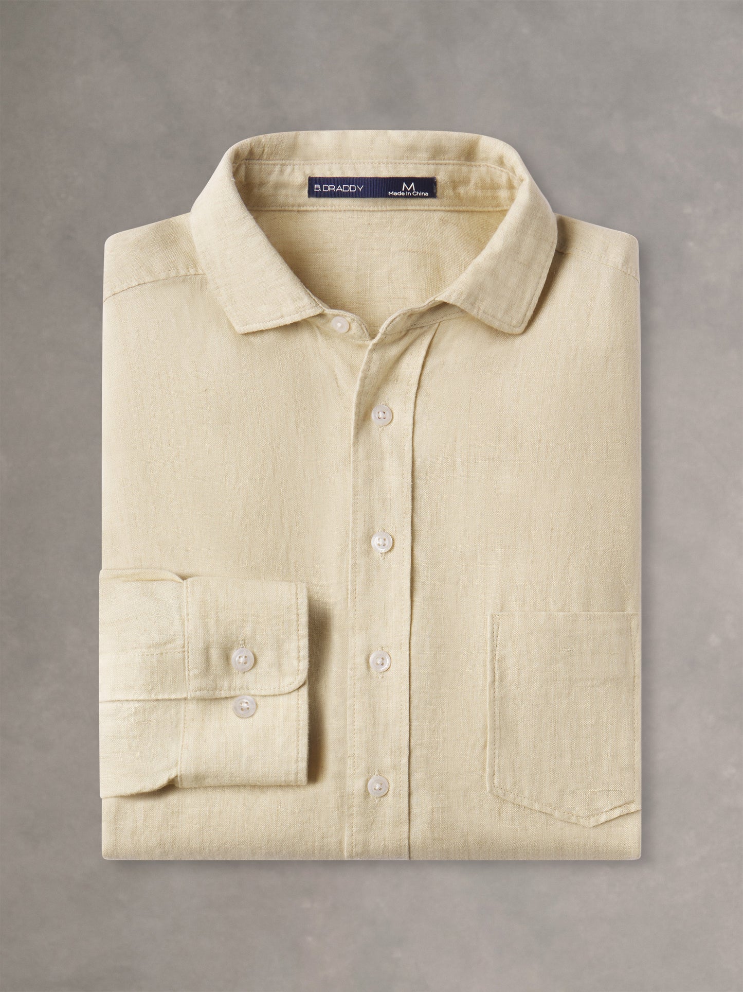 - Long-sleeve with spread collar and topped-on, 8-button front placket