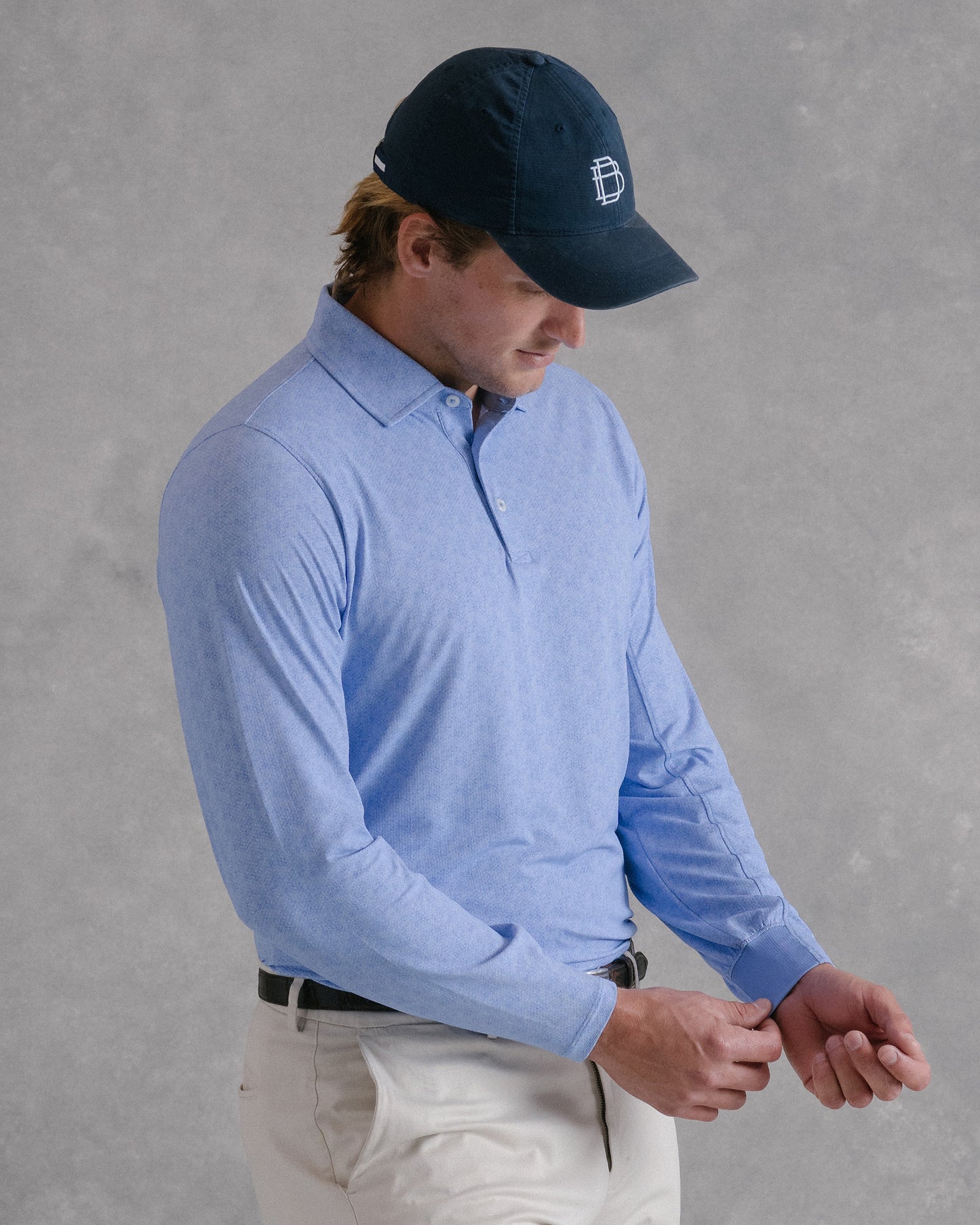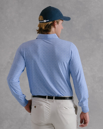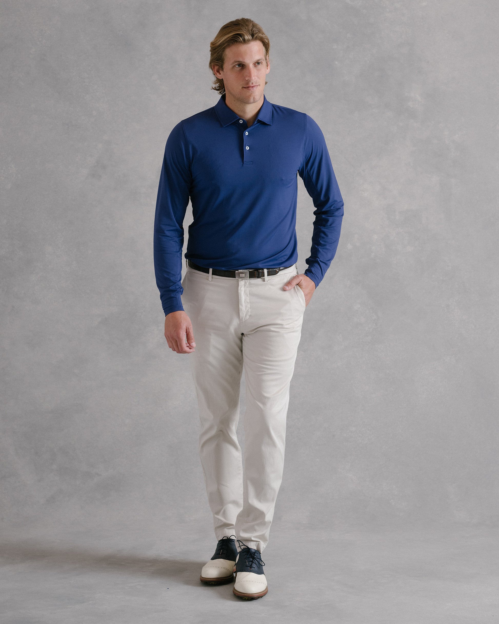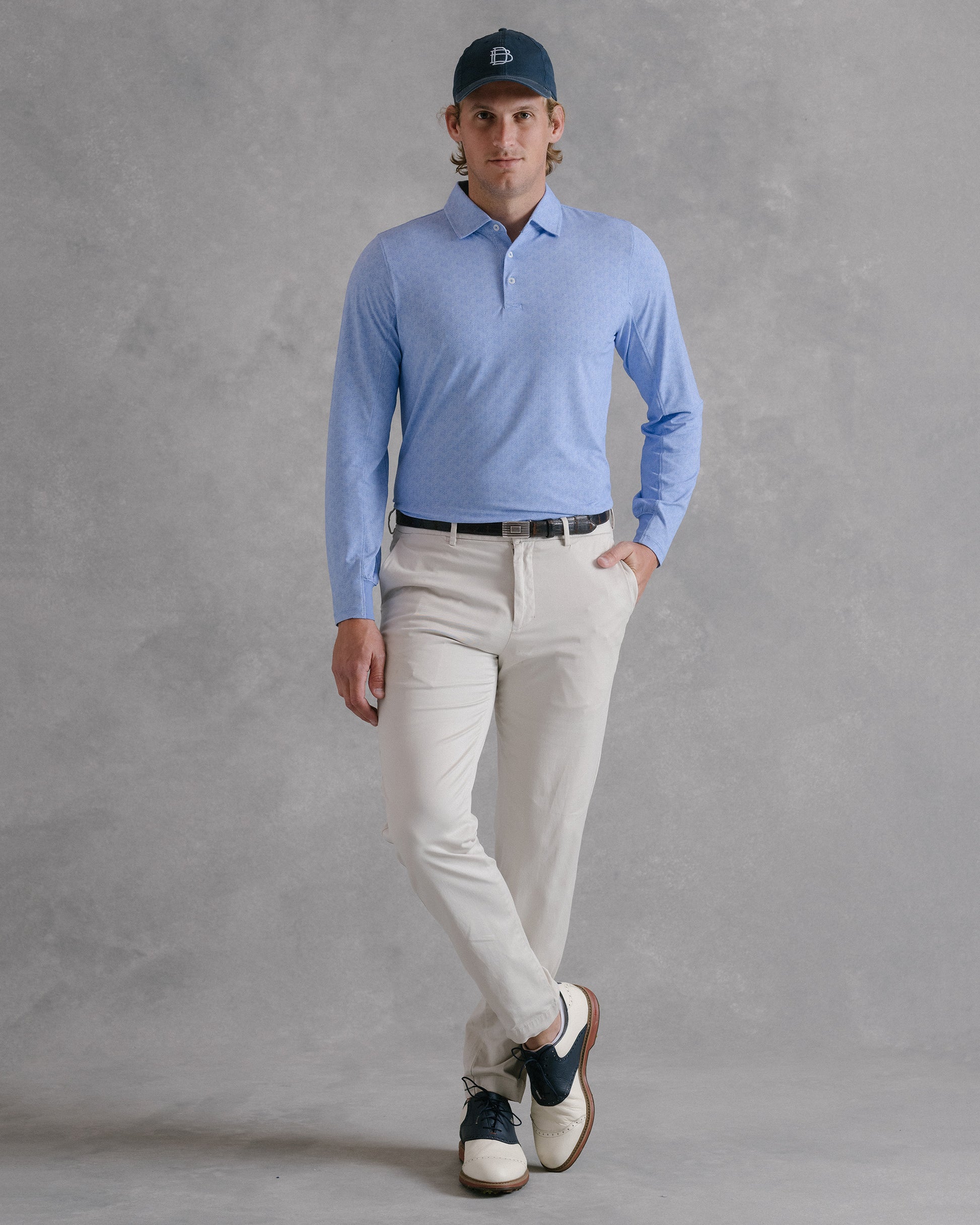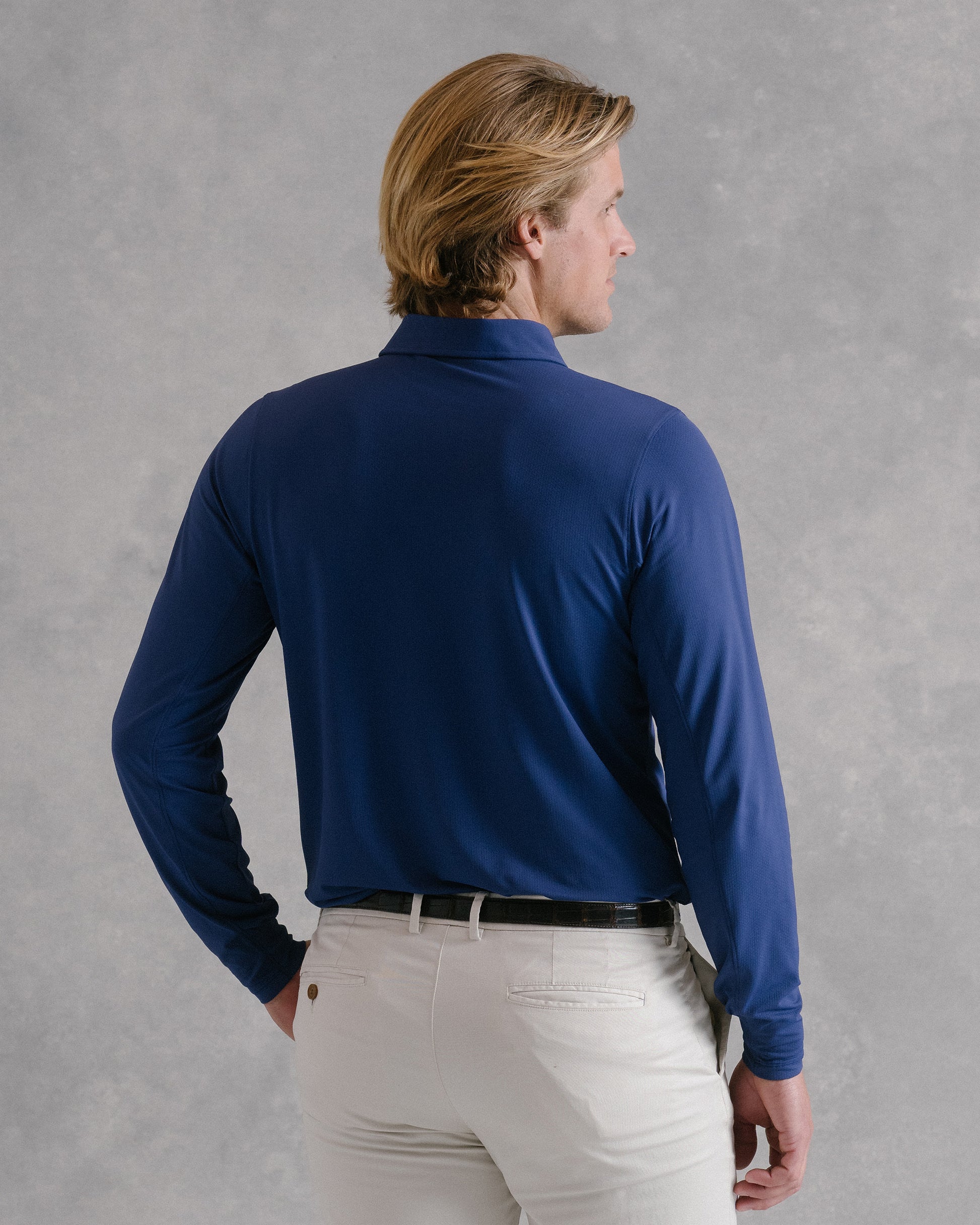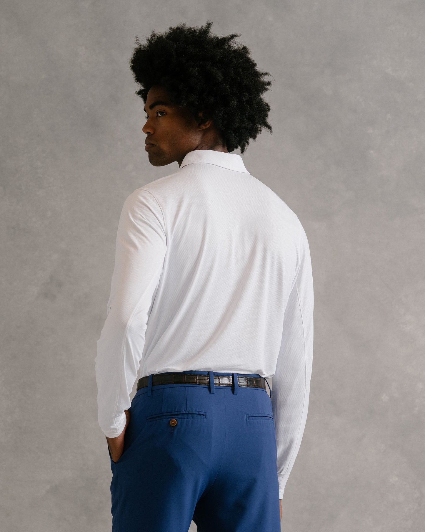 Stay cool and dry all day long in this lightweight long sleeve. It’s made with a blended nylon stretch knit fabric, and features a slightly textured surface that keeps fresh air flowing through. The tailored collar keeps things buttoned-up, making it a convenient choice for both the course and the clubhouse.