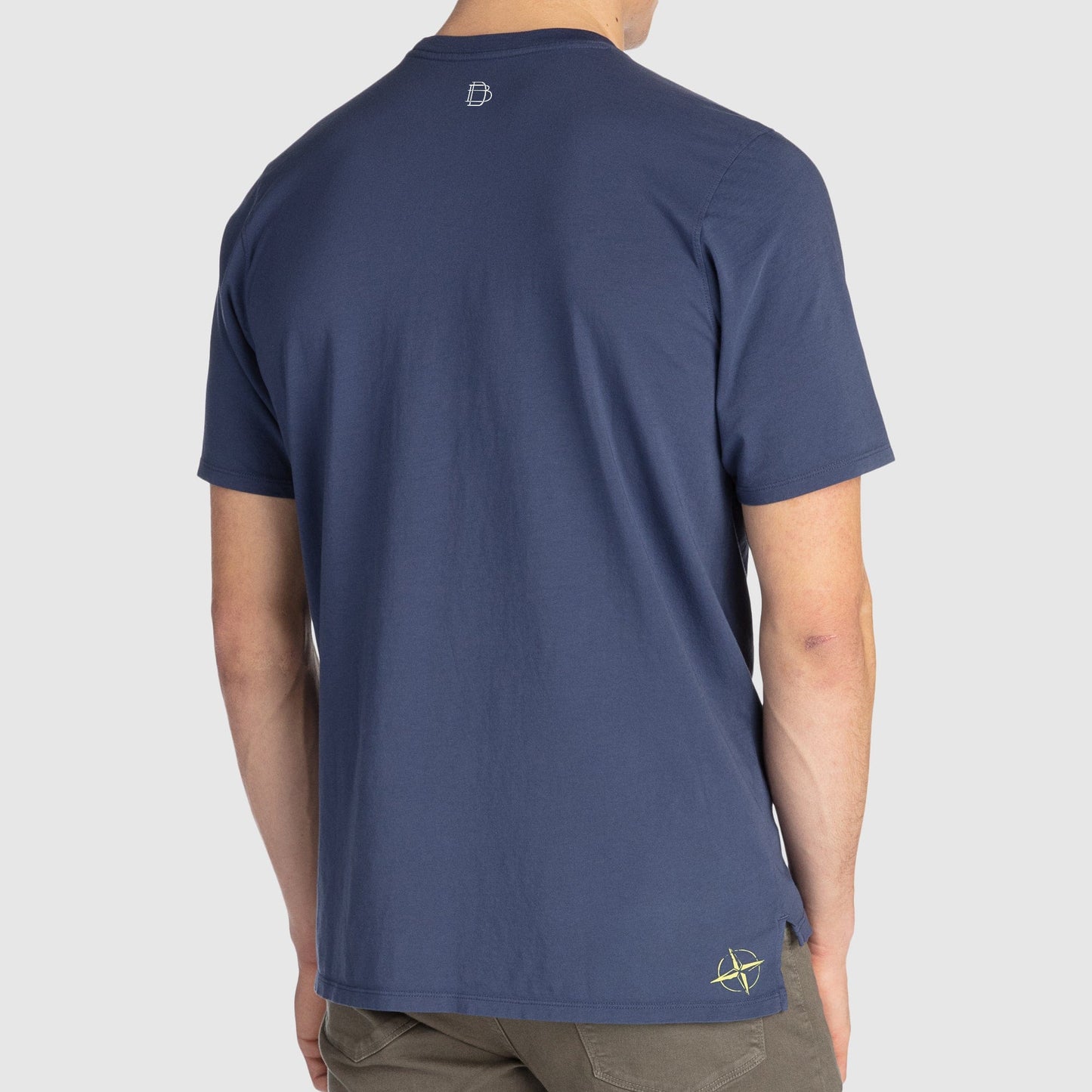 • Classic vented hem with B. Draddy compass logo at back right