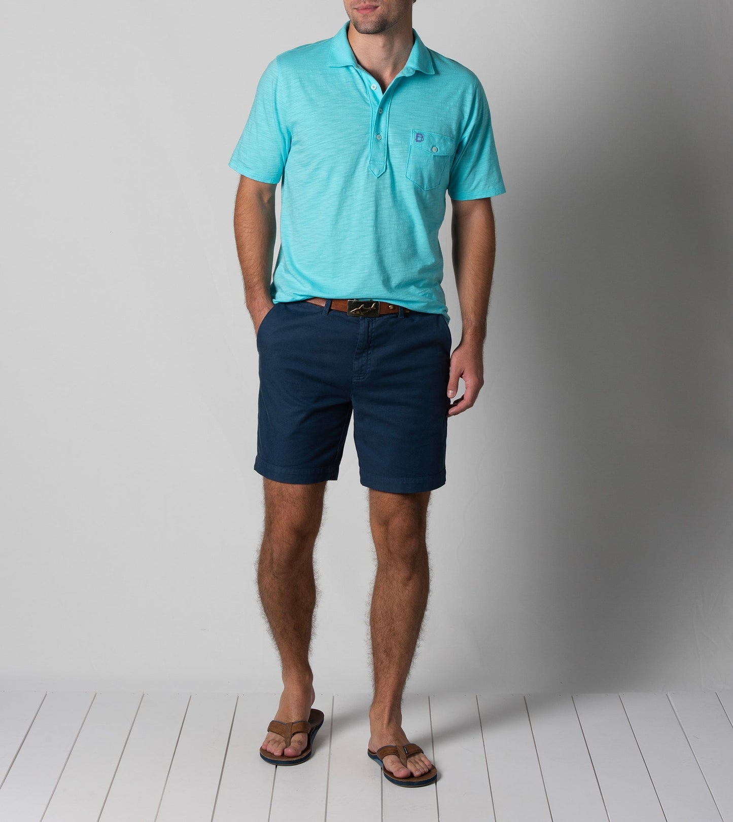 - Casual, one-piece, self-fabric collar with 4-button henley placket